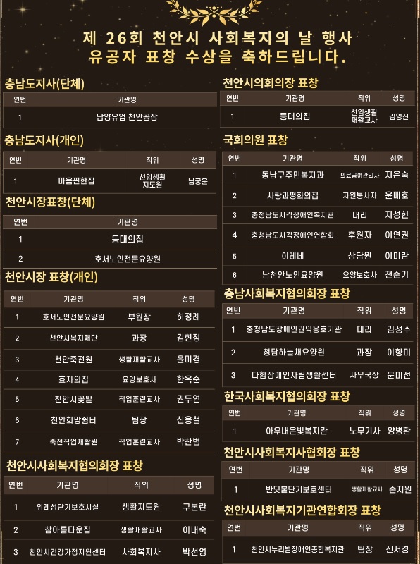 제 26회 천안시사회복지의 날 행사 유공자 표창수상 페이지 정보 작성자작성자 : 천사협 조회조회수 : 589회 작성일작성일 : 25-09-23 13:14 본문 수상을 축하 드립니다! 목록 다음글「제26회 천안시사회복지의 날 행사」사회복지 유공자 추천 협조 요청 25.07.28